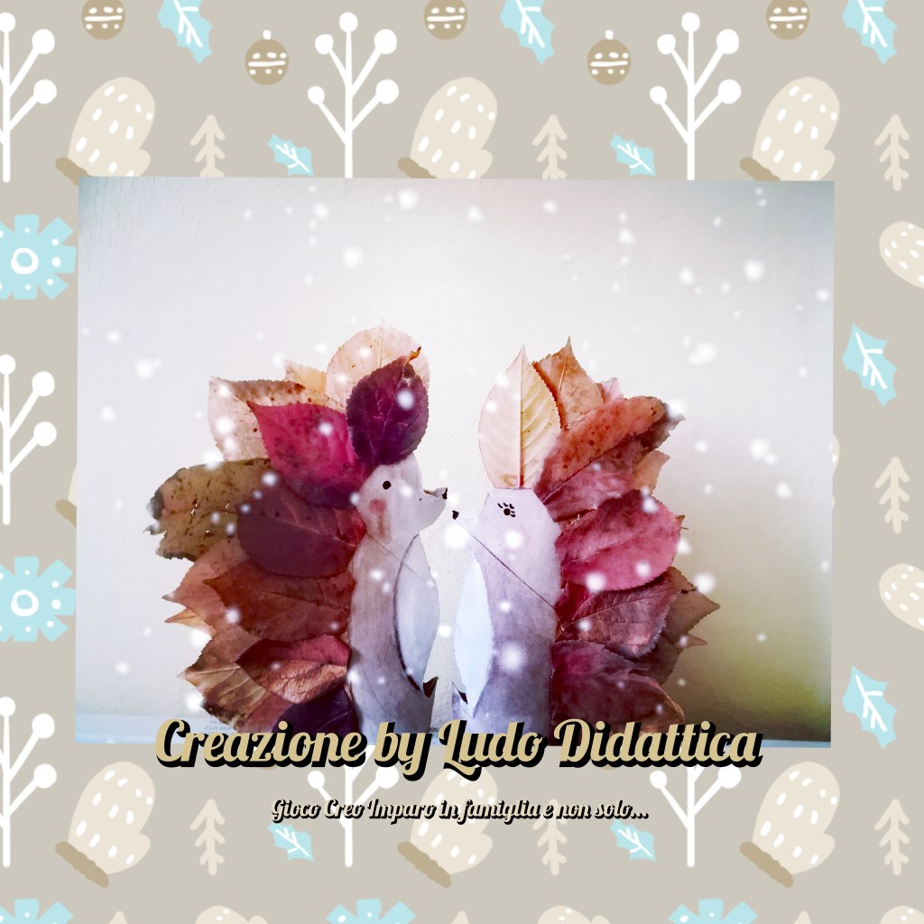 Abbiamo disegnato sul rotolo la sagoma del riccio e il viso, ritagliato il laterale per creare il panciotto, poi colorato sfumando col marroncino e bianco, infine attaccato le foglie come una sorta di coroncina.